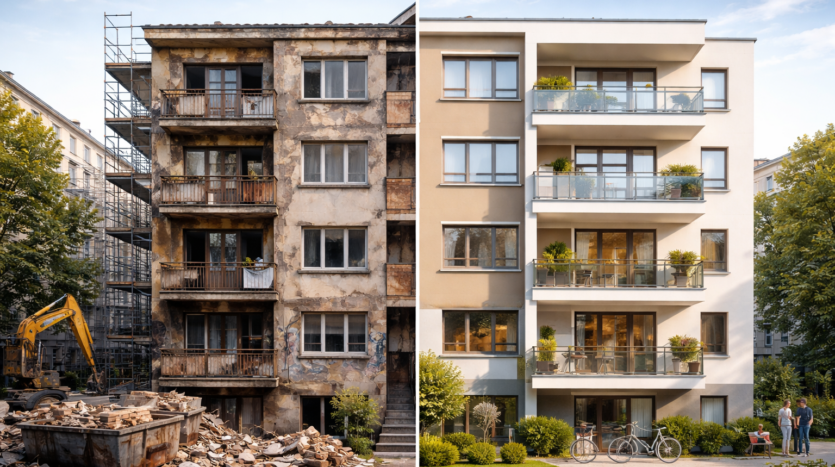 Logements anciens en immeuble collectif, à condition de réaliser des travaux représentant au moins 30 % du prix d’acquisition du bien, ce qui correspond à une rénovation lourde et non à un simple rafraîchissement.